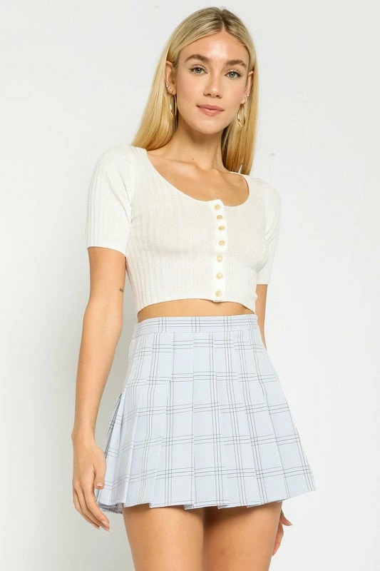 Our Ribbed Cropped Sweater Top features a button up front and fitted body. Knit. Model’s Measurements: Height 5’10 | Bust 32 | Waist 24 | Hips 36 | Size S