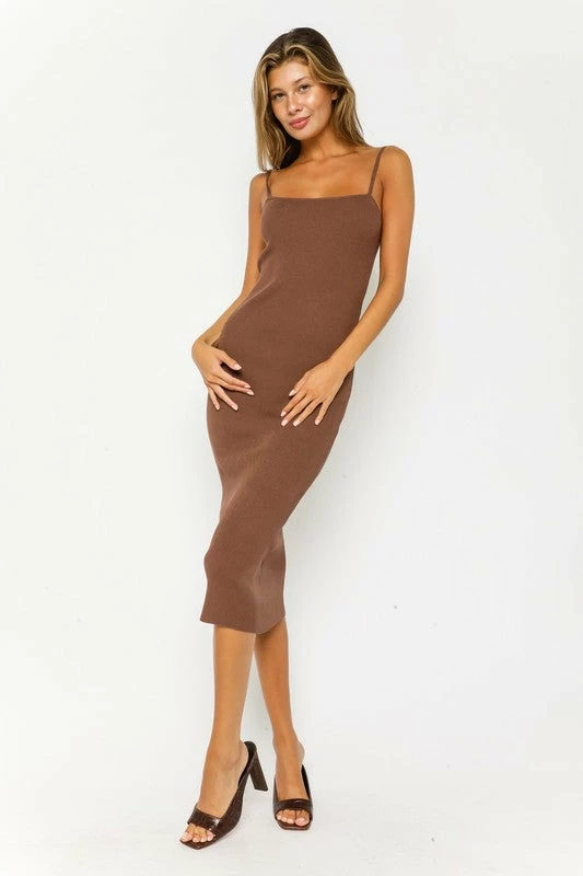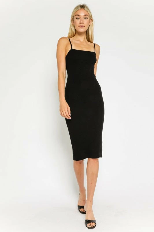 Our Ribbed Midi Dress features a squareneck and fitted body. Knit. Model’s Measurements: Height 5’10 | Bust 32 | Waist 24 | Hips 36 | Size S