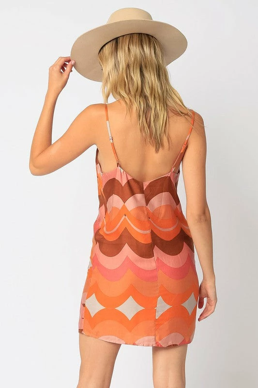 Our Sorbet Retro Waves Tank Dress features a v neck and adjustable straps.