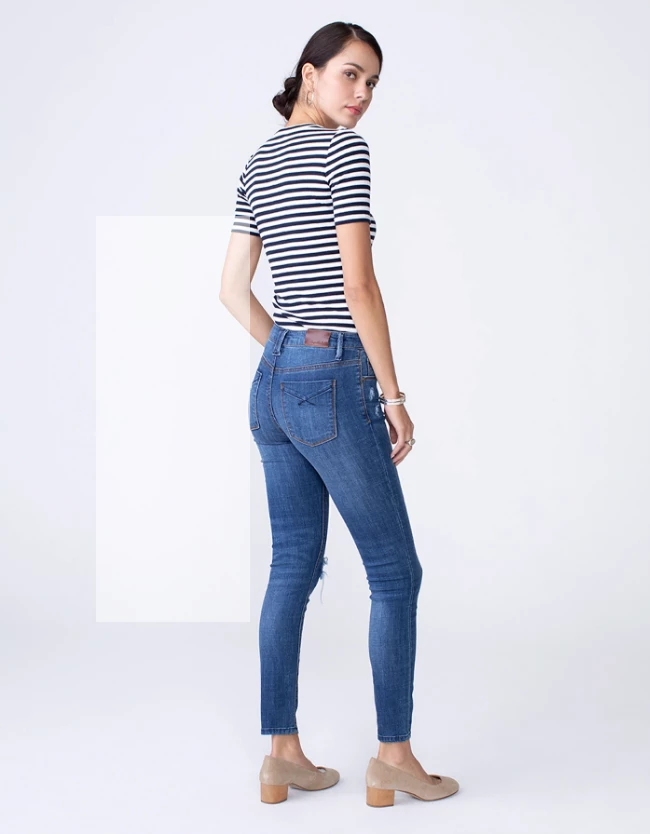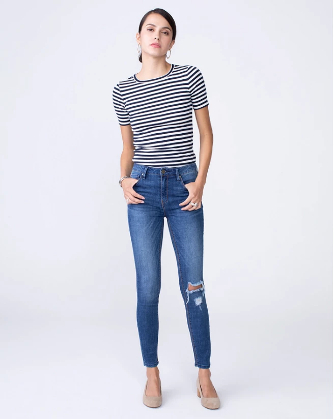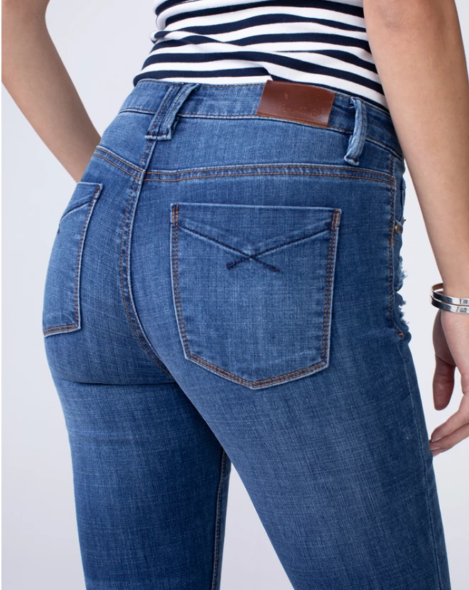 - Lean and sexy, this high waist skinny will hug you just right in our soft, super stretch quality denim. This style hits right at your natural waist, is fitted through the hips and thighs and has a slim leg. This perfect blue shade has hand sanding, whisker details, and just enough destruction for a little edge. 5-pocket styling with a button and zip fly closure. Antique brass hardware with 2-tone stitching. Elongate those legs with this ankle-length cut.