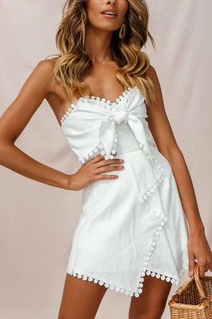Sleeveless bandeau mini romper with bow tie front, faux wrap asymmetric design, and pom pom crochet trim on the edge, back invisible zipper 65% COTTON 35% POLYESTER.