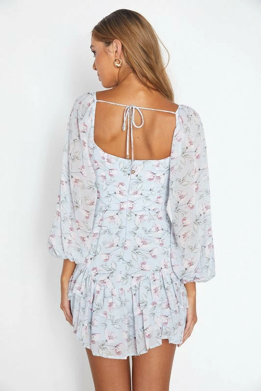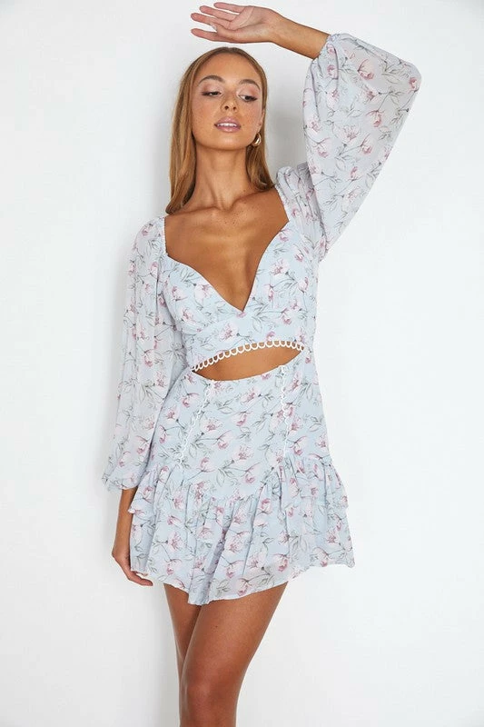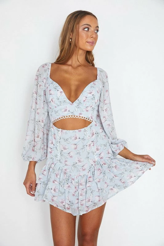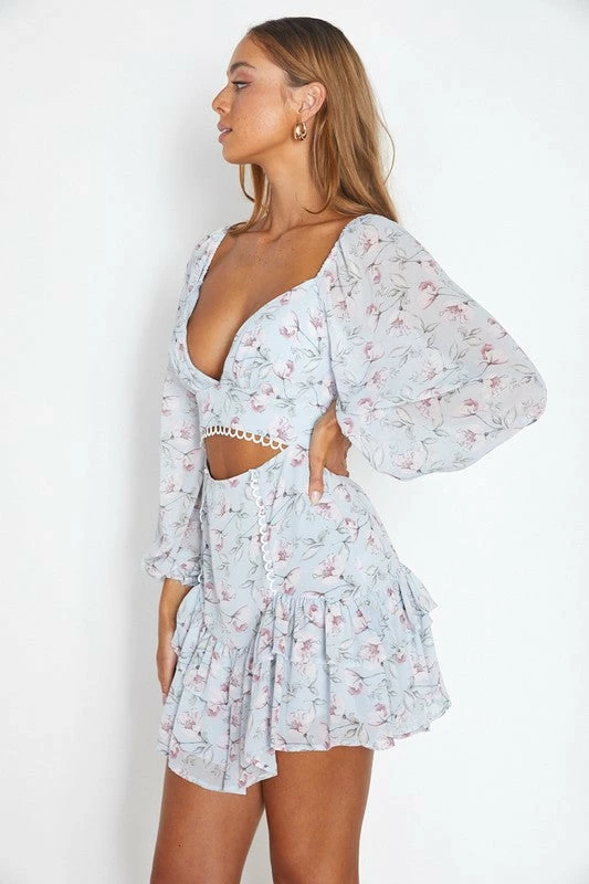 One & Only Collection The Becca Blue Floral Balloon Sleeve Cutout Mini Dress