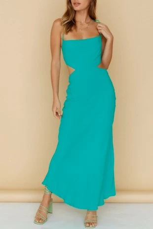 Cami draped cowl neck slip dress with side cutout and lace up open back, back invisible zipper 100% POLYESTER.