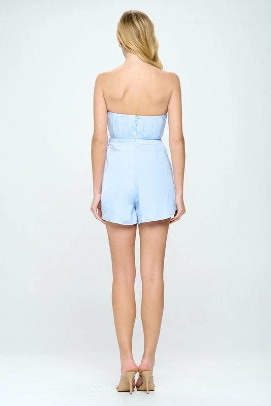 Sweetheart neck bandeau mini romper with pleated front and faux wrap front, back invisible zipper 100% POLYESTER