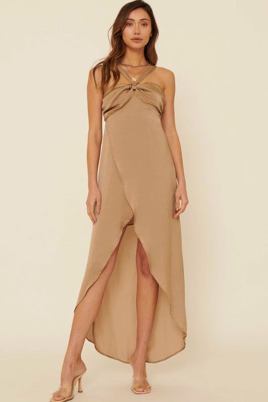 A solid, woven maxi dress with the following features: Sweetheart neckline. Halter strap with back self-tie closure. Sleeveless. Elastic waist. Wrapped tulip hem. Open back. Relaxed fit. Model Info: Height: 5 ft 9 in | Bust: 32 in | Waist: 25 in | Hips: 34 in | Wearing Size S.