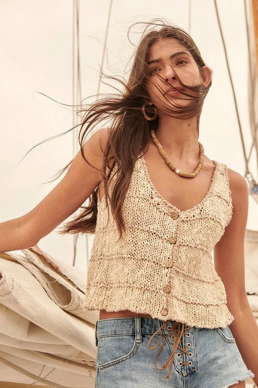 U neckline. Sleeveless. Button-front closure. Tank shoulder straps. Textured stripe detail throughout. U back. Slit hemline. Relaxed fit. Model Info: Height: 5 ft 9 in | Bust: 31 in | Waist: 24 in | Hips: 34 in | Wearing Size S.