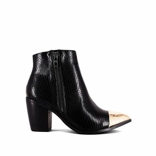 • Synthetic snake textured leather upper with metallic pointed toe cover detail