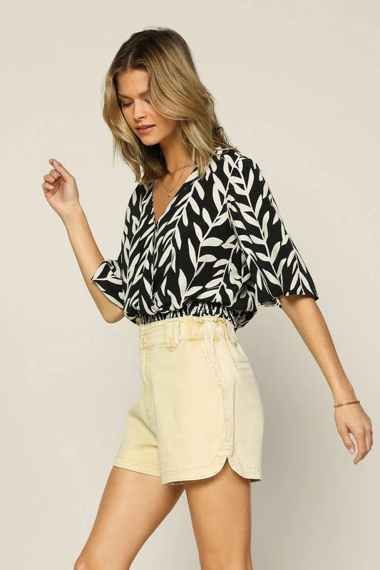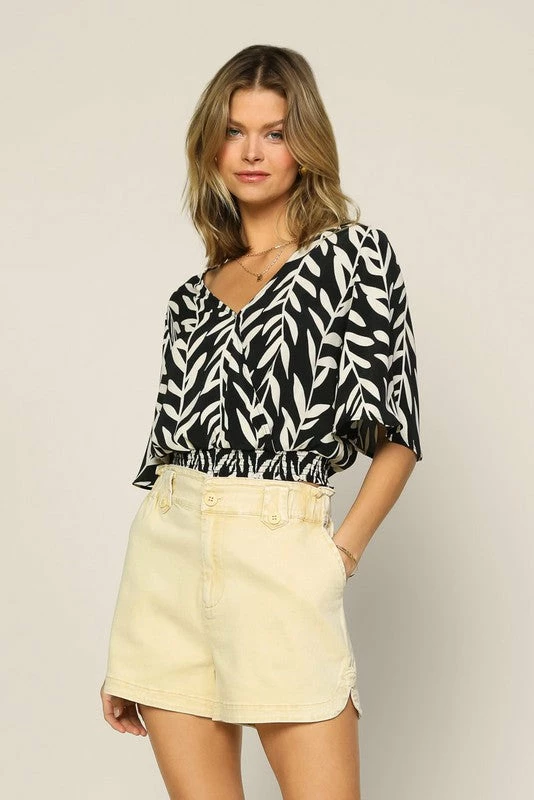 Short Sleeve Printed Crop Top With Smocked Hem. Model is: Height: 5'8 1/2 Bust: 32" Waist: 24" HIP: 34 | Model wears size Small.