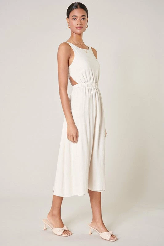 - Elastic waist - Strappy back - Open back - Breathable fabric - Comes in 2 colors Size + Fit - Model is 5'9" and wearing size XS - Measurements taken from size S - Chest: 36 1/2" - Length: 45 1/2" Self: 70% Rayon, 30% Linen Lining: 96% Polyester, 4% Spandex.