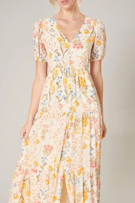 - Tiered - Rouleau buttons - Puff sleeves - Elastic waist - Color: Floral Multi