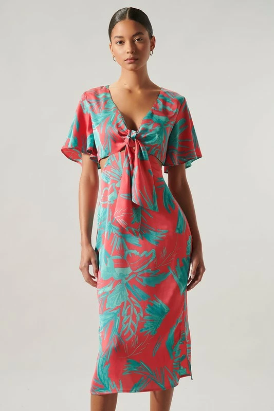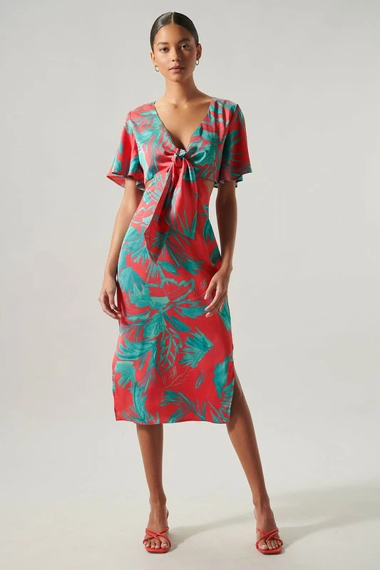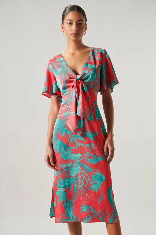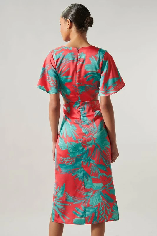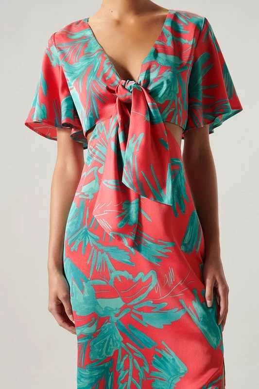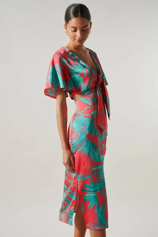 SugarLips The Palm Tropics Pink & Green Satin Front Tie Midi Dress