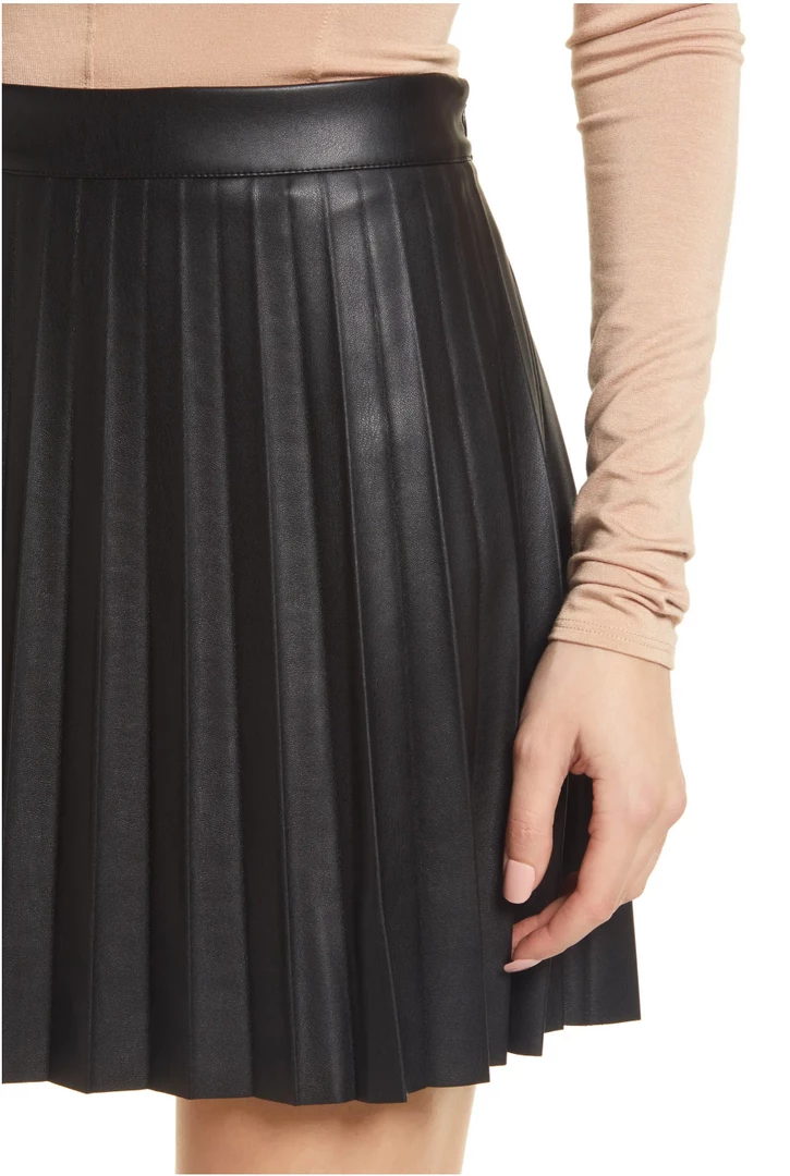 Clean pleats bring a studious, school-girl aesthetic to this faux-leather skirt.