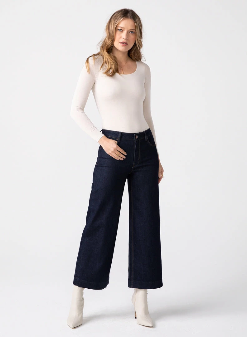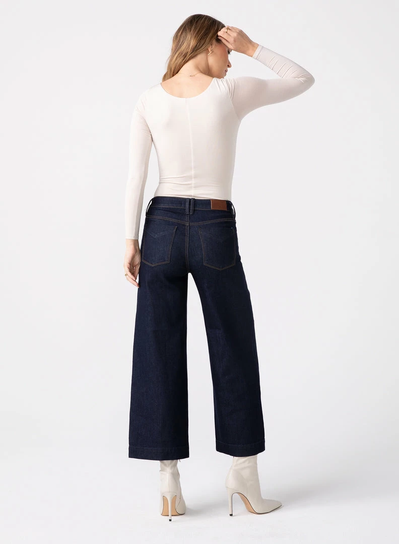 - With a vintage-inspired cut, our high waist 5-pocket culotte is a must-have silhouette. This style hits right at your natural waist, is fitted through the hips, and then fully relaxes into a cropped wide leg. Our soft, stretch recycled denim will give you all the comfort and you can also feel good knowing this fabrication is made with repreve fibers made out of recycled plastic bottles. The seaming down the front leg comes with built-in pockets and adds a slimming twist to this classic shape. This style is stonewashed, hand-sanded, and whiskered to that perfect mid-blue shade for an authentic vintage look. 5-pocket styling with a button and zip fly closure. Antique copper hardware with contrast stitching.