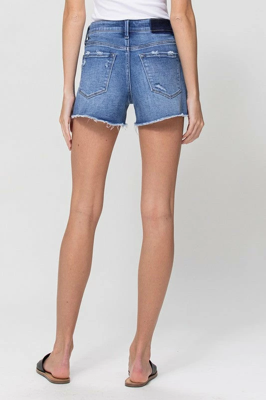 COMFORT STRETCH DENIM, HIGH RISE, RAW HEMLINE , SHORTS 92% COTTON 6% POLYESTER 2% SPANDEX MODEL IS 5′ 9” WEARING SIZE 26.