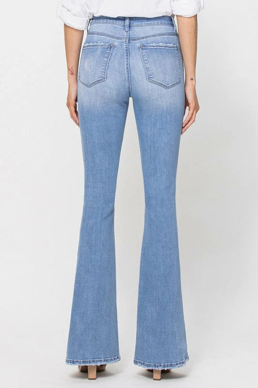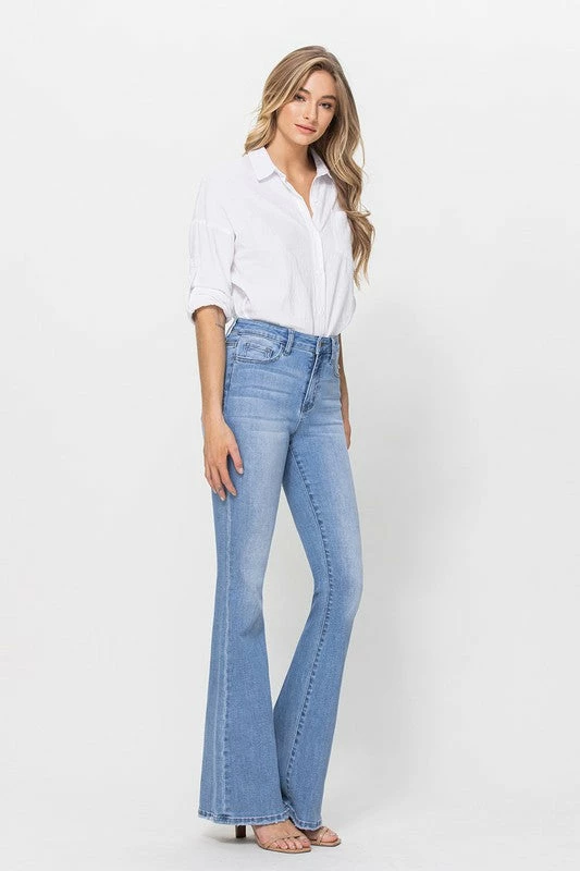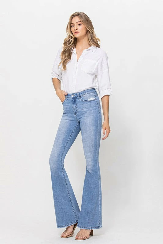 HIGH RISE LONG FLARE – COMFORT STRETCH DENIM, HIGH RISE, FULL LENGTH, FLARE JEAN F. RISE: 10″ / INSEAM: 34” / LEG OPENING: 22” 90% COTTON 8% POLYESTER 2% SPANDEX MODEL IS 5′ 9” WEARING SIZE 26.