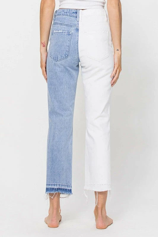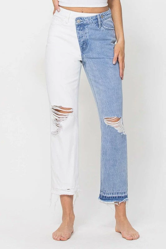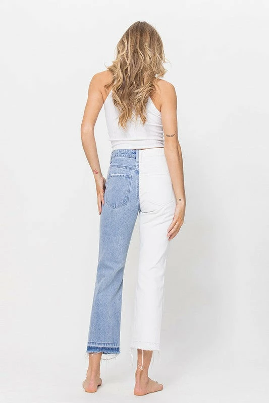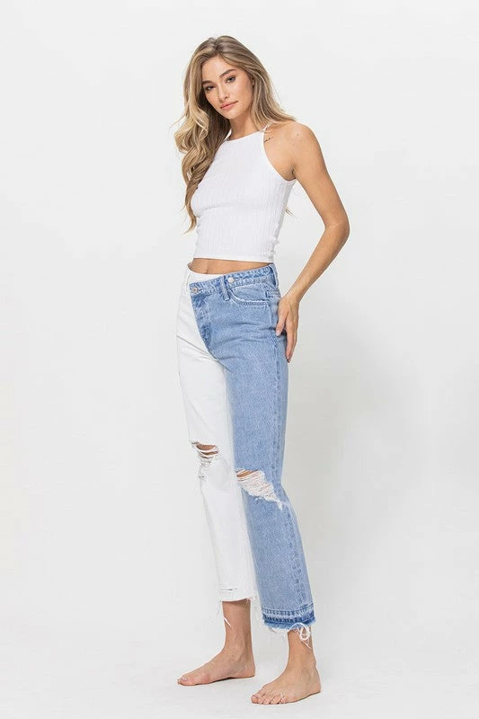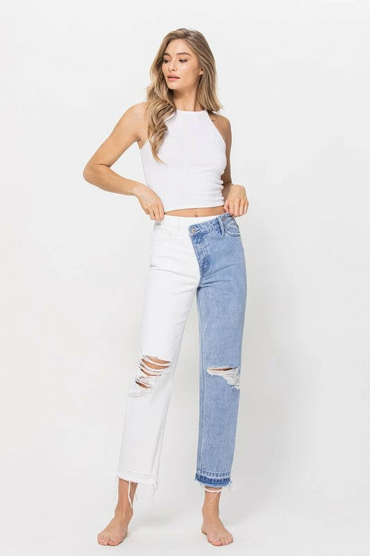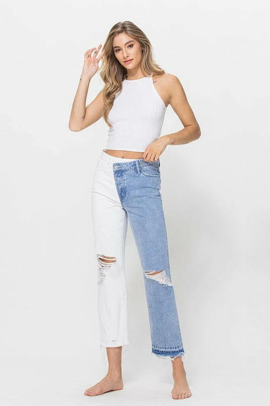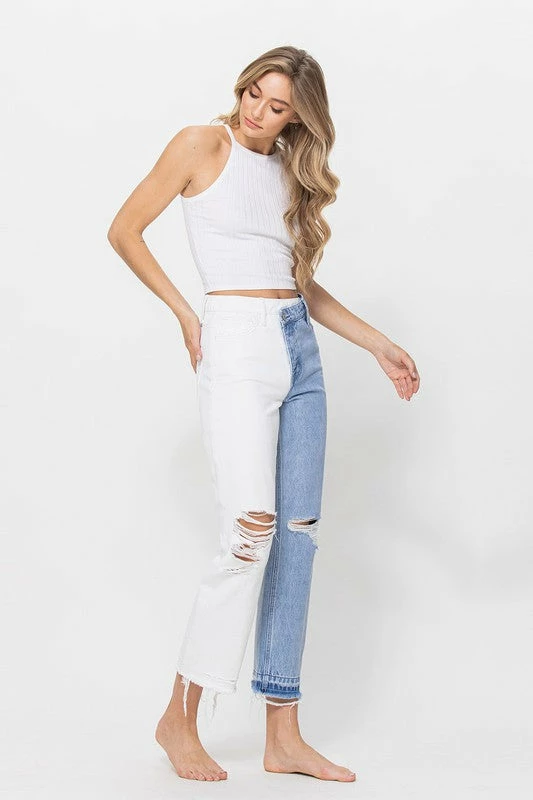 HIGH RISE CROP STRAIGHT W/CRISS CROSS WB SPLIT 2 TONE & RELEASED HEM – NON STRETCH DENIM, DISTRESSED DETAIL, HIGH RISE, CROPPED LENGTH, CRISS CROSS WAIST BAND, SPLIT 2 TONE, RELEASED HEMLINE, COLOR BLOCK, STRAIGHT JEAN F. RISE: 10 1/2″ / INSEAM: 26 1/4” / LEG OPENING: 15” 100% COTTON MODEL IS 5′ 9” WEARING SIZE 26.