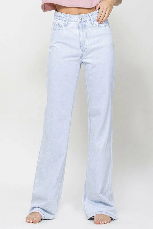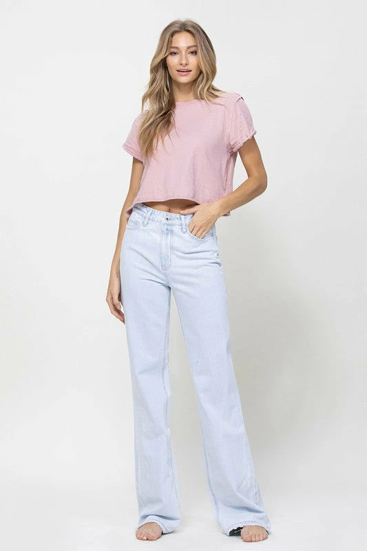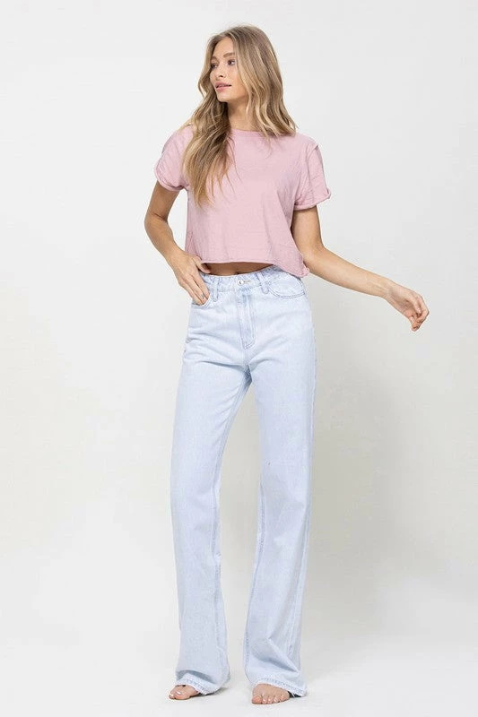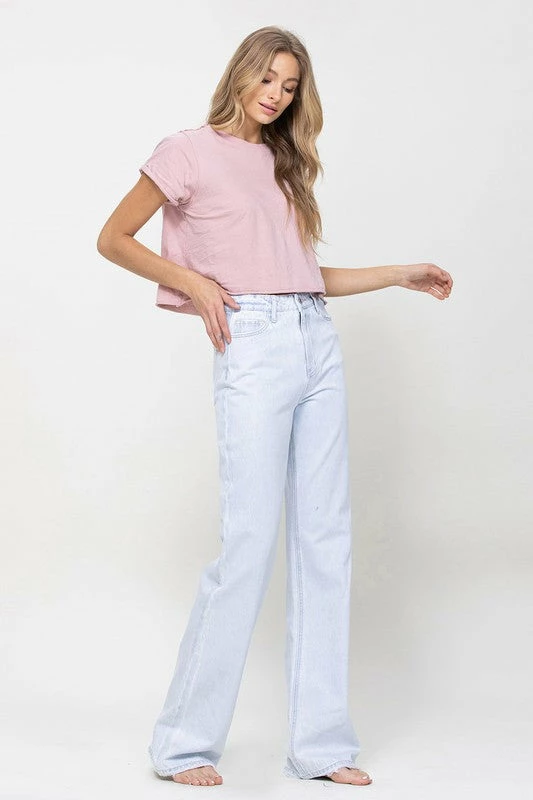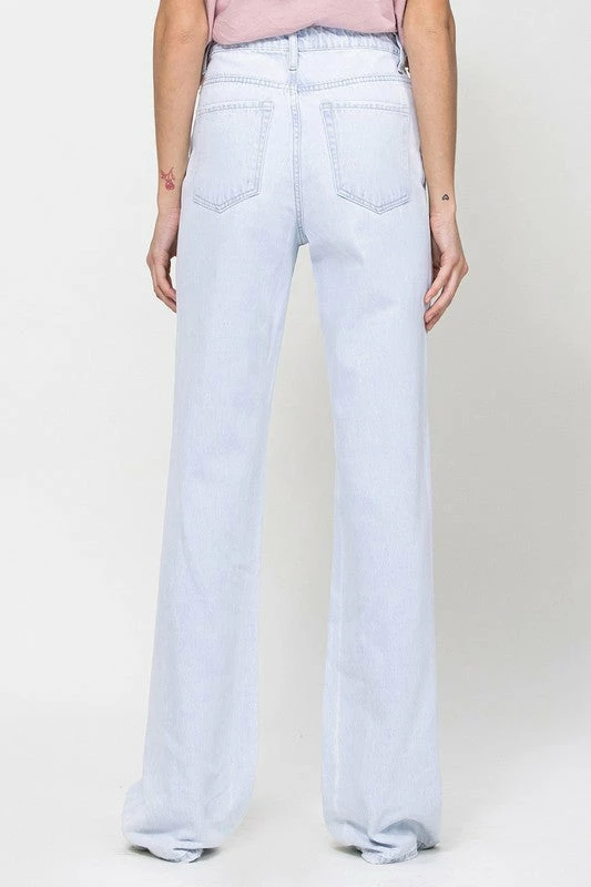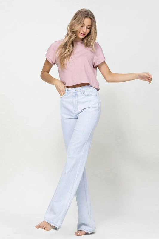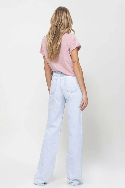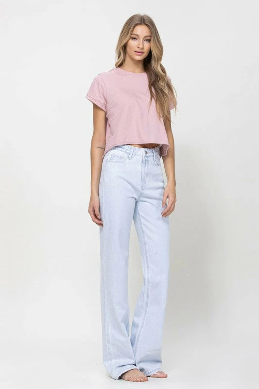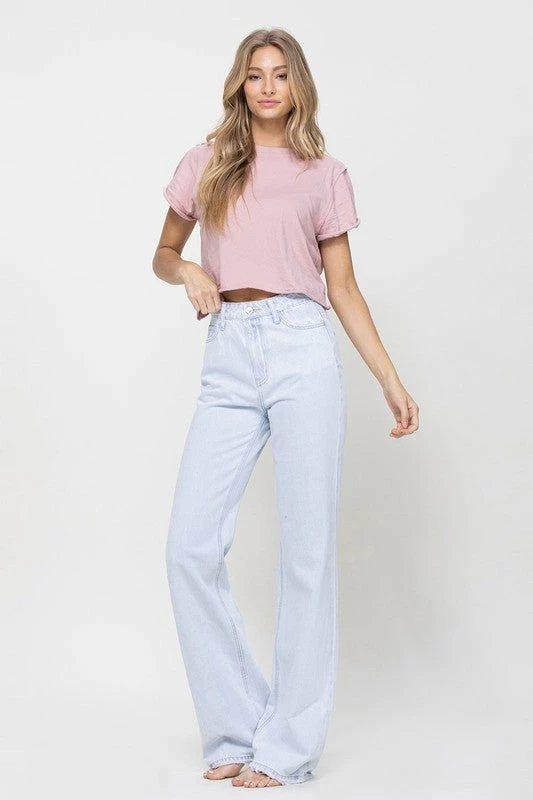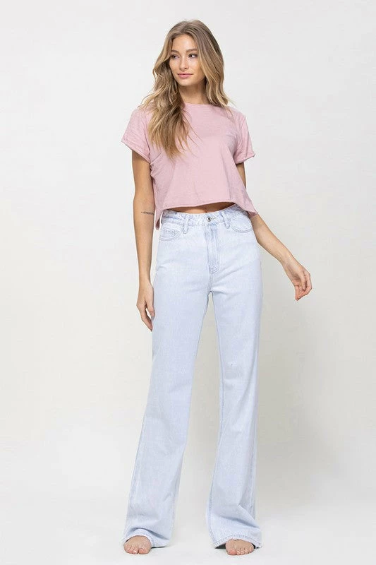 90’S VINTAGE FLARE – NON STRETCH DENIM, SUPER HIGH WAISTED, RELAXED LEGS, FLARE JEAN, FULL LENGTH, WIDE LEG, AUTHENTIC RIGID JEANS TEXTURE, 90’S VINTAGE JEANS F. RISE: 11 1/2″ / INSEAM: 34” / LEG OPENING: 20” 100% COTTON MODEL IS 5′ 9” WEARING SIZE 26.