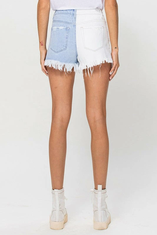 HIGH RISE SHORT W BLOCKING DETAIL – NON STRETCH DENIM, DISTRESSED DETAIL, HIGH RISE, SPLIT 2 TONE, RELEASED HEMLINE, COLOR BLOCK, SHORTS F. RISE: 3 1/4″ / INSEAM: 3 1/4” / LEG OPENING: 24 3/4” 100% COTTON MODEL IS 5′ 9” WEARING SIZE 26.