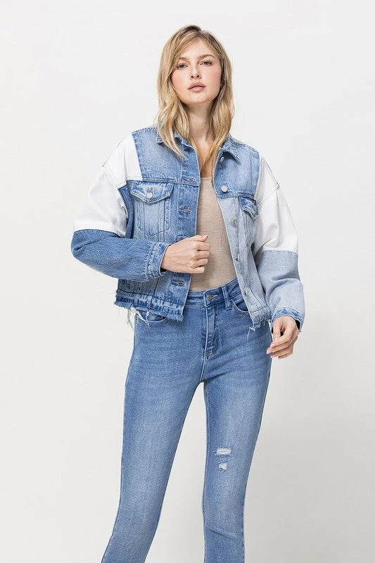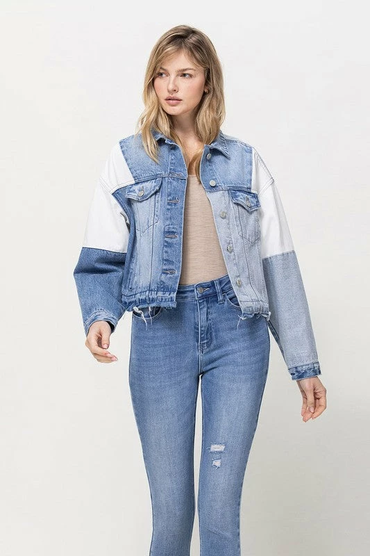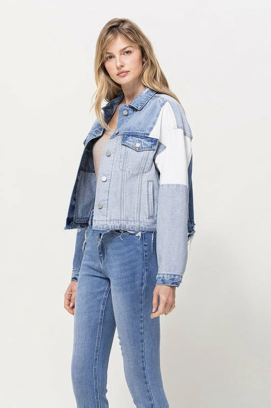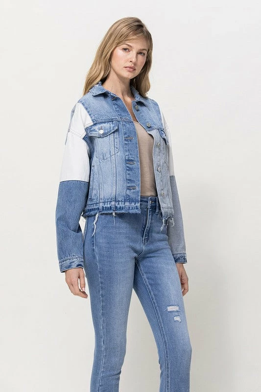 OVERSIZED CROP JACKET W BLOCKING CONTRAST DETAILS. - NON STRETCH DENIM, OVERSIZED CROP JACKET, COLOR BLOCK, RELEASED HEMLINE. BUST: 22 1/4" / HPS: 21 1/2'' 100% COTTON MODEL IS 5' 9'' WEARING SIZE S.