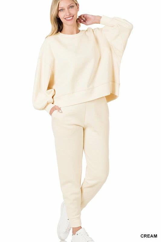 BALLOON SLEEVE SWEATSHIRT & SWEATPANTS SET – THICK & SOFT FABRIC ** SWEATSHIRT (SAME AS OT-2876BA) TOTAL BODY LENGTH: 22.5″(front), BUST: 54″ approx. – MEASURED FROM SMALL ** SWEATPANTS TOTAL WAIST: 27″, INSEAM: 27.5″ approx. – MEASURED FROM SMALL *